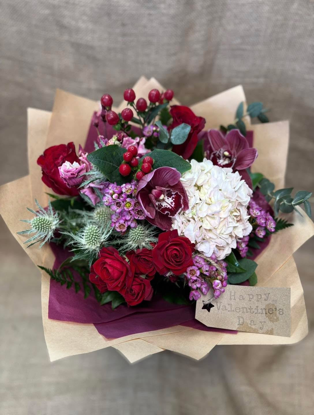 Celebrate Valentine’s Day with a beautiful seasonal selection of romantic blooms in an elegant palette of pinks and reds.
